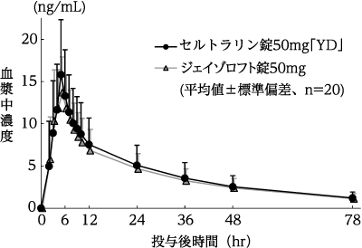 セルトラリン錠50mg「YD」とジェイゾロフト錠50mgをクロスオーバー法によりそれぞれ1錠(セルトラリンとして50mg)、健康成人男子20名に絶食単回経口投与して血漿中未変化体濃度を測定した。得られた薬物動態パラメータ(AUC、Cmax)について90%信頼区間法にて統計解析を行った結果、log(0.80)~log(1.25)の範囲内であり、両剤の生物学的同等性が確認された16)。