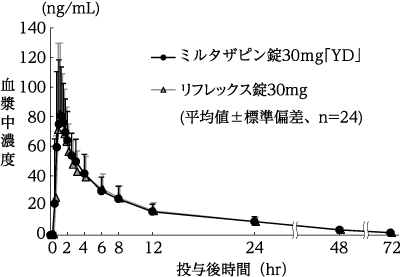 ミルタザピン錠15mg「YD」は「含量が異なる経口固形製剤の生物学的同等性試験ガイドライン(平成24年2月29日 薬食審査発0229第10号)」に基づき、ミルタザピン錠30mg「YD」を標準製剤としたとき、溶出挙動に基づき生物学的に同等とみなされた21)。