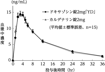 ドキサゾシン錠2mg「YD」とカルデナリン錠2mgをクロスオーバー法によりそれぞれ1錠(ドキサゾシンとして2mg)、健康成人男子15名に絶食単回経口投与して血漿中未変化体濃度を測定した。得られた薬物動態パラメータ(AUC、Cmax)について統計解析を行った結果、両剤の生物学的同等性が確認された8)。