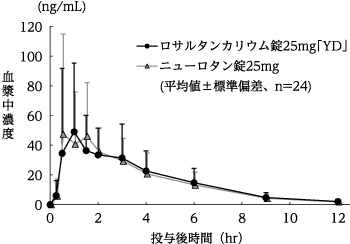 ロサルタンカリウム錠25mg「YD」とニューロタン錠25mgをクロスオーバー法によりそれぞれ1錠(ロサルタンカリウムとして25mg)、健康成人男子24名に絶食単回経口投与して血漿中未変化体濃度を測定した。得られた薬物動態パラメータ(AUC、Cmax)について統計解析を行った結果、両剤の生物学的同等性が確認された7)。