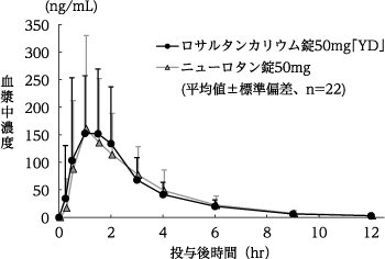 ロサルタンカリウム錠50mg「YD」とニューロタン錠50mgをクロスオーバー法によりそれぞれ1錠(ロサルタンカリウムとして50mg)、健康成人男子22名に絶食単回経口投与して血漿中未変化体濃度を測定した。得られた薬物動態パラメータ(AUC、Cmax)について統計解析を行った結果、両剤の生物学的同等性が確認された8)。