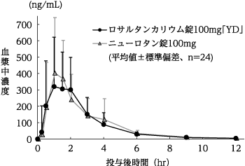 ロサルタンカリウム錠100mg「YD」とニューロタン錠100mgをクロスオーバー法によりそれぞれ1錠(ロサルタンカリウムとして100mg)、健康成人男子24名に絶食単回経口投与して血漿中未変化体濃度を測定した。得られた薬物動態パラメータ(AUC、Cmax)について統計解析を行った結果、両剤の生物学的同等性が確認された9)。