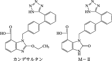 カンデサルタン シレキセチルはカルボキシルエステラーゼにより活性代謝物カンデサルタンに代謝され、さらに一部がCYP2C9により非活性代謝物M-Ⅱに代謝されるが、本態性高血圧症患者にカンデサルタン シレキセチルを投与したときのM-Ⅱの血中濃度及び尿中排泄率はカンデサルタンの血中濃度及び尿中排泄率に比べ低く、CYP2C9の遺伝的多型によるカンデサルタンの血中濃度への影響は少ないと考えられる5)。また、カンデサルタンはCYP1A1、1A2、2A6、2B6、2C8、2C9、2C19、2D6、2E1、3A4の代謝活性を阻害しない10)(in vitro)。