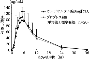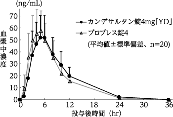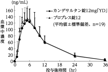 カンデサルタン錠12mg「YD」とブロプレス錠12をクロスオーバー法によりそれぞれ1錠(カンデサルタン シレキセチルとして12mg)、健康成人男子19名に絶食単回経口投与して、血漿中活性代謝物濃度を測定した。得られた薬物動態パラメータ(AUC、Cmax)について統計解析を行った結果、両剤の生物学的同等性が確認された8)。