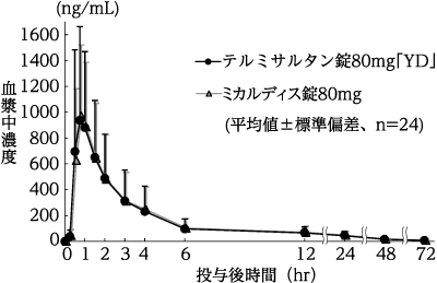 テルミサルタン錠80mg「YD」とミカルディス錠80mgをクロスオーバー法によりそれぞれ1錠(テルミサルタンとして80mg)、健康成人男子24名に絶食単回経口投与して、血漿中未変化体濃度を測定した。得られた薬物動態パラメータ(AUC、Cmax)について90%信頼区間法にて統計解析を行った結果、log(0.80)~log(1.25)の範囲内であり、両剤の生物学的同等性が確認された11)。