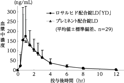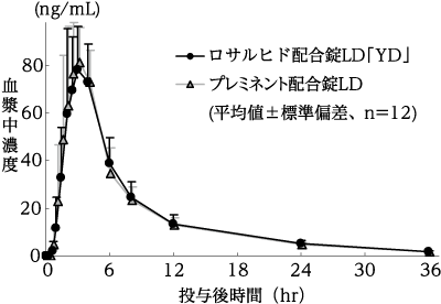 ロサルヒド配合錠HD「YD」は「含量が異なる経口固形製剤の生物学的同等性試験ガイドライン(平成24年2月29日 薬食審査発0229第10号)」に基づき、ロサルヒド配合錠LD「YD」を標準製剤としたとき、溶出挙動に基づき生物学的に同等とみなされた20)。