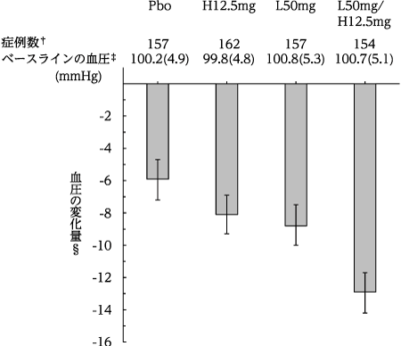 Pbo=プラセボ、L=ロサルタンカリウム、H=ヒドロクロロチアジド†主要評価項目のFAS解析対象例、‡平均値(標準偏差)、§最小二乗平均値(95%CI)