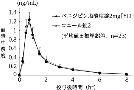 ベニジピン塩酸塩錠2mg「YD」とコニール錠2をクロスオーバー法によりそれぞれ2錠(ベニジピン塩酸塩として4mg)、健康成人男子23名に絶食単回経口投与して血漿中未変化体濃度を測定した。得られた薬物動態パラメータ(AUC、Cmax)について統計解析を行った結果、両剤の生物学的同等性が確認された2)。