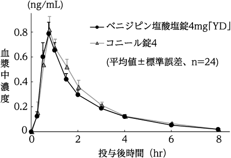 ベニジピン塩酸塩錠4mg「YD」とコニール錠4をクロスオーバー法によりそれぞれ1錠(ベニジピン塩酸塩として4mg)、健康成人男子24名に絶食単回経口投与して血漿中未変化体濃度を測定した。得られた薬物動態パラメータ(AUC、Cmax)について統計解析を行った結果、両剤の生物学的同等性が確認された3)。
