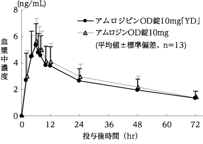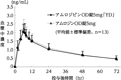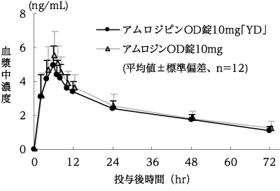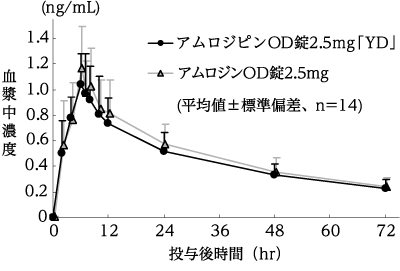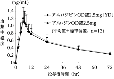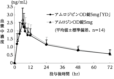 アムロジピンOD錠2.5mg「YD」とアムロジンOD錠2.5mgをクロスオーバー法によりそれぞれ1錠(アムロジピンとして2.5mg)、健康成人男子14名に絶食単回経口投与して血漿中未変化体濃度を測定した。得られた薬物動態パラメータ(AUC、Cmax)について統計解析を行った結果、両剤の生物学的同等性が確認された8)。