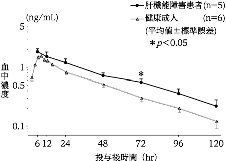 成人肝硬変患者(Child分類A、B)5例にアムロジピンとして2.5mgを単回投与した場合の血中濃度推移並びに薬物動態パラメータは図及び表の通りである。健康成人に比し、投与72時間後の血中濃度が有意に上昇し、t1/2、AUCはやや高値を示したが有意差は認められなかった14)。
