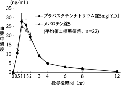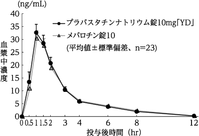 プラバスタチンナトリウム錠5mg「YD」とメバロチン錠5をクロスオーバー法によりそれぞれ2錠(プラバスタチンナトリウムとして10mg)、健康成人男子22名に絶食単回経口投与して血漿中未変化体濃度を測定した。得られた薬物動態パラメータ(AUC、Cmax)について統計解析を行った結果、両剤の生物学的同等性が確認された2)。
