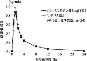 シンバスタチン錠5mg「YD」とリポバス錠5をクロスオーバー法によりそれぞれ1錠(シンバスタチンとして5mg)、健康成人男子24名に絶食単回経口投与して血漿中未変化体濃度を測定した。得られた薬物動態パラメータ(AUC、Cmax)について統計解析を行った結果、両剤の生物学的同等性が確認された4)。