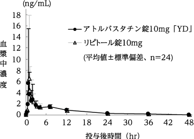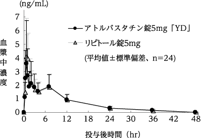 健康成人6例に、アトルバスタチン5注1)、10、20及び40mgを絶食下単回経口投与した結果、血漿中未変化体のCmax及びAUC0-∞は投与量に比例して増加し、Tmax及び半減期はほぼ一定であったことから、アトルバスタチンの体内動態は線形性を示すと考えられた1)。なお、日本人と外国人との体内動態を比較した結果、個人差を上回る人種差は認められなかった2)。