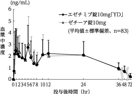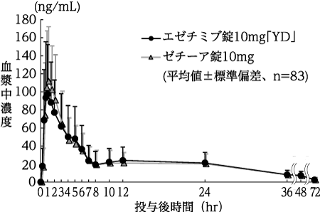 エゼチミブ錠10mg「YD」とゼチーア錠10mgをクロスオーバー法によりそれぞれ1錠(エゼチミブとして10mg)、健康成人男子83名に絶食単回経口投与してエゼチミブ(非抱合体)及び活性代謝物エゼチミブ抱合体の血漿中濃度を測定した。得られた薬物動態パラメータ(AUC、Cmax)について90%信頼区間法にて統計解析を行った結果、log(0.80)~log(1.25)の範囲内であり、両剤の生物学的同等性が確認された8)。