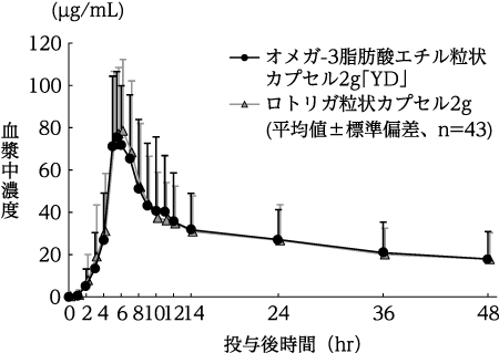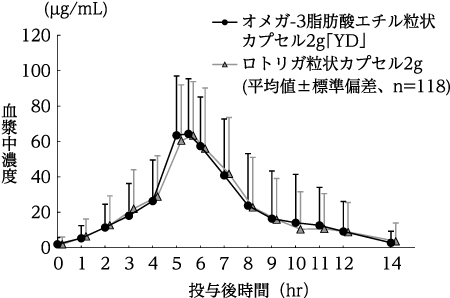 オメガ-3脂肪酸エチル粒状カプセル2g「YD」とロトリガ粒状カプセル2gをクロスオーバー法によりそれぞれ1包(オメガ-3脂肪酸エチルとして2g)、健康成人男性43名に食直後単回経口投与して血漿中イコサペント酸濃度を測定した。投与前値で補正した値より得られた薬物動態パラメータ(ΔAUC、ΔCmax)について90%信頼区間法にて統計解析を行った結果、log(0.80)~log(1.25)の範囲内であり、両剤の生物学的同等性が確認された6)。