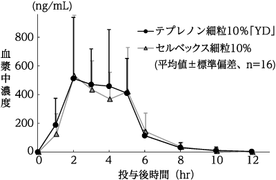 テプレノン細粒10%「YD」とセルベックス細粒10%をクロスオーバー法によりそれぞれ1g(テプレノンとして100mg)、健康成人男子16名に食後単回経口投与して血漿中未変化体濃度を測定した。得られた薬物動態パラメータ(AUC、Cmax)について統計解析を行った結果、両剤の生物学的同等性が確認された2)。
