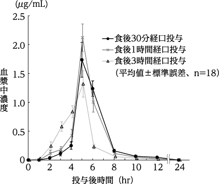 健康成人男子(18名)にテプレノン3カプセル(テプレノンとして150mg注1))をクロスオーバー法で食後30分、1時間及び3時間に経口投与し、血漿中濃度を測定し、下図及び下表に示した。血漿中濃度曲線下面積(AUC)は食後30分投与を100%とすると、食後1時間投与では変化なく、食後3時間投与では約23%低下した3)。