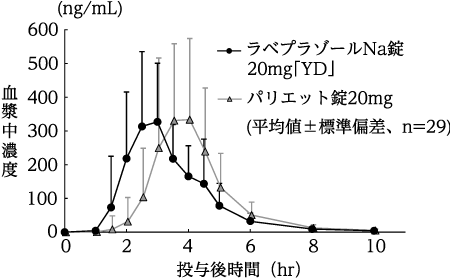 ラベプラゾールNa錠20mg「YD」とパリエット錠20mgをクロスオーバー法によりそれぞれ1錠(ラベプラゾールナトリウムとして20mg)、健康成人男子29名に絶食単回経口投与して血漿中ラベプラゾールナトリウム未変化体濃度を測定した。得られた薬物動態パラメータ(AUC、Cmax)について統計解析を行った結果、両剤の生物学的同等性が確認された3)。