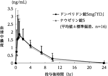 ドンペリドン錠5mg「YD」とナウゼリン錠5をクロスオーバー法によりそれぞれ1錠(ドンペリドンとして5mg)、健康成人男子16名に絶食単回経口投与して血清中未変化体濃度を測定した。得られた薬物動態パラメータ(AUC、Cmax)について統計解析を行った結果、両剤の生物学的同等性が確認された1)。