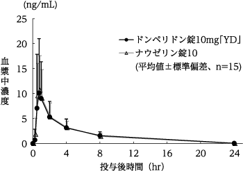 ドンペリドン錠10mg「YD」とナウゼリン錠10をクロスオーバー法によりそれぞれ1錠(ドンペリドンとして10mg)、健康成人男子15名に絶食単回経口投与して血漿中未変化体濃度を測定した。得られた薬物動態パラメータ(AUC、Cmax)について統計解析を行った結果、両剤の生物学的同等性が確認された2)。