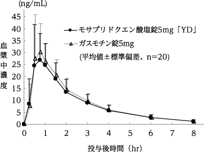 モサプリドクエン酸塩錠5mg「YD」とガスモチン錠5mgをクロスオーバー法によりそれぞれ1錠(モサプリドクエン酸塩として5mg)、健康成人男子20名に絶食単回経口投与して血漿中未変化体濃度を測定した。得られた薬物動態パラメータ(AUC、Cmax)について統計解析を行った結果、両剤の生物学的同等性が確認された4)。