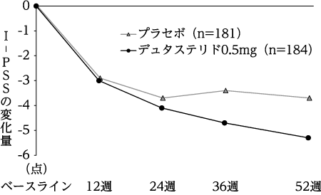前立腺体積30mL以上の前立腺肥大症患者を対象とした二重盲検比較試験22)(1日1回52週間経口投与)において、デュタステリドカプセル0.5mgはプラセボに比し、I-PSS及び最大尿流率を有意に改善し、前立腺体積を有意に減少させた。