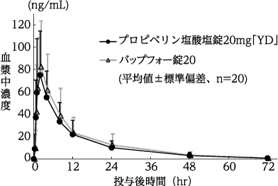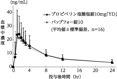プロピベリン塩酸塩錠10mg「YD」とバップフォー錠10をクロスオーバー法によりそれぞれ1錠(プロピベリン塩酸塩として10mg)、健康成人男子16名に絶食単回経口投与して血漿中未変化体濃度を測定した。得られた薬物動態パラメータ(AUC、Cmax)について統計解析を行った結果、両剤の生物学的同等性が確認された4)。