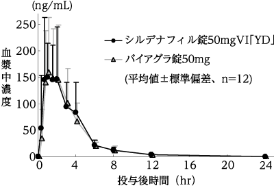 シルデナフィル錠50mgVI「YD」とバイアグラ錠50mgをクロスオーバー法によりそれぞれ1錠(シルデナフィルとして50mg)、健康成人男子12名に絶食単回経口投与して血漿中未変化体濃度を測定した。得られた薬物動態パラメータ(AUC、Cmax)について統計解析を行った結果、両剤の生物学的同等性が確認された14)。