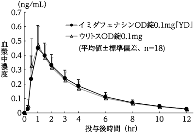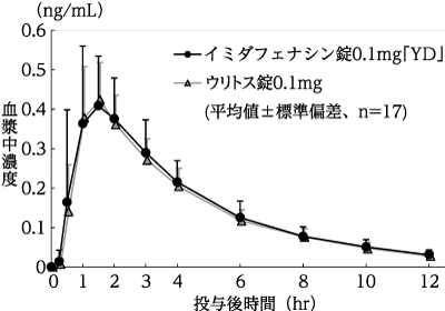 イミダフェナシン錠0.1mg「YD」とウリトス錠0.1mgをクロスオーバー法によりそれぞれ1錠(イミダフェナシンとして0.1mg)、健康成人男子17名に絶食単回経口投与して血漿中未変化体濃度を測定した。得られた薬物動態パラメータ(AUC、Cmax)について90%信頼区間法にて統計解析を行った結果、log(0.80)~log(1.25)の範囲内であり、両剤の生物学的同等性が確認された3)。