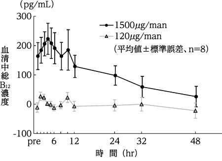 健康成人男子に1,500μgを12週間反復経口投与し、投与中止後4週間の血清中総B12量の変動率を検討した。投与4週間で投与前値の約2倍に達し、以後も漸増し、12週後には約2.8倍を示した。投与中止4週後でも投与前値の約1.8倍を示した2),3)。