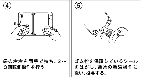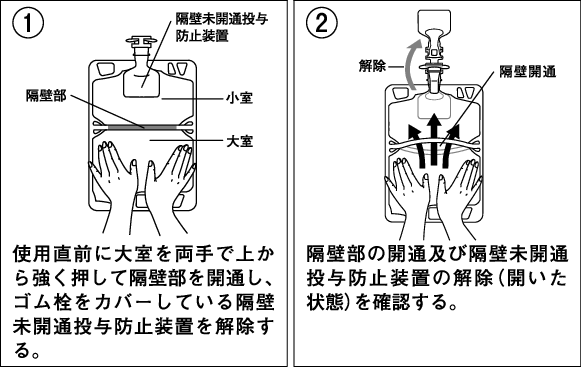 用時に隔壁を開通して大室液と小室液をよく混合する。通常、成人には1回500mLを末梢静脈内に点滴静注する。投与速度は通常、500mL当たり120分を目安とし、高齢者、重篤な患者には更に緩徐に注入する。なお、年齢、症状、体重により適宜増減するが、最大投与量は1日2500mLまでとする。