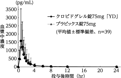 クロピドグレル錠75mg「YD」とプラビックス錠75mgをクロスオーバー法によりそれぞれ1錠(クロピドグレルとして75mg)、健康成人男子39名に絶食単回経口投与して血漿中未変化体濃度を測定した。得られた薬物動態パラメータ(AUC、Cmax)について90%信頼区間法にて統計解析を行った結果、log(0.80)~log(1.25)の範囲内であり、両剤の生物学的同等性が確認された11)。