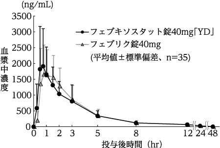 健康成人男性6例に、フェブキソスタットとして40mgを朝食後に1日1回7日間反復経口投与したとき、血漿中フェブキソスタット濃度は投与開始後3日で定常状態に達し、反復投与による蓄積性は認められなかった6)。