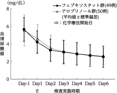 化学療法施行予定の悪性腫瘍患者99例を対象にアロプリノール対照非盲検無作為化比較試験を行った。フェブキソスタット60mg/日又はアロプリノールは300mg/日[腎機能障害のある患者(30≦eGFR<45mL/min/1.73m2)では200mg/日]を化学療法施行開始24時間前から6日間投与した。投与開始6日後までの血清尿酸値AUC(主要評価項目)は、アロプリノール群に対するフェブキソスタット群の非劣性が示された(非劣性マージンは150mg・hr/dL)。また、フェブキソスタット60mg/日の投与により血清尿酸値は投与開始6日後まで経時的に減少した31),32)。本試験におけるフェブキソスタット60mg/日の安全性評価対象49例中1例(2.0%)に副作用が認められた。その副作用は、AST増加、ALT増加であった。