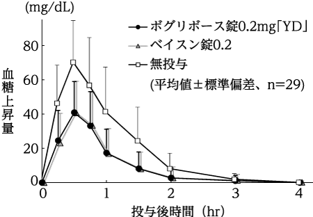 ボグリボース錠0.2mg「YD」とベイスン錠0.2を健康成人男子29名にそれぞれ3錠(ボグリボースとして0.6mg)注2)空腹時単回経口投与し、無投与群を含む3群(クロスオーバー法)に対し、ショ糖負荷(100g)における血糖値の上昇量を経時的に測定した。その結果、無投与群に比較して両剤とも有意な血糖上昇抑制作用を示した。また、得られたパラメータ(AUC、Cmax)について統計解析を行った結果、両剤の生物学的同等性が確認された16)。