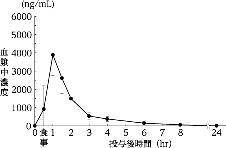 健康成人10例に50mgを食前30分に単回経口投与すると、血漿中濃度は1時間後に最高に達し、その濃度は3.9μg/mLである。血漿中半減期は1.8時間で、血漿中濃度は4時間後に0.37μg/mLとなる2)。