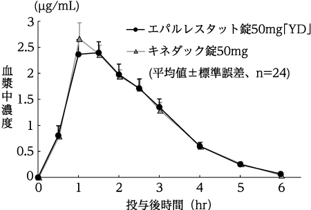 エパルレスタット錠50mg「YD」とキネダック錠50mgをクロスオーバー法によりそれぞれ1錠(エパルレスタットとして50mg)、健康成人男子24名に絶食単回経口投与して血漿中未変化体濃度を測定した。得られた薬物動態パラメータ(AUC、Cmax)について統計解析を行った結果、両剤の生物学的同等性が確認された3)。