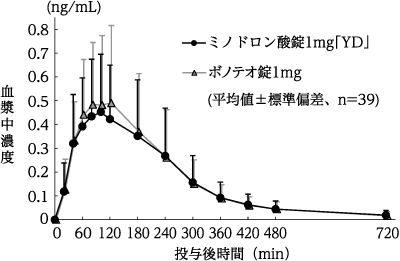 ミノドロン酸錠1mg「YD」とボノテオ錠1mgをクロスオーバー法によりそれぞれ1錠(ミノドロン酸水和物として1mg)、健康閉経後女性39名に絶食単回経口投与して血漿中未変化体濃度を測定した。得られた薬物動態パラメータ(AUC、Cmax)について90%信頼区間法にて統計解析を行った結果、log(0.80)~log(1.25)の範囲内であり、両剤の生物学的同等性が確認された5)。