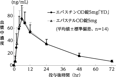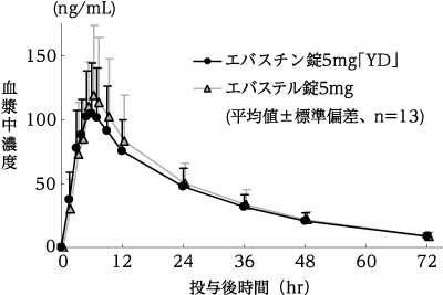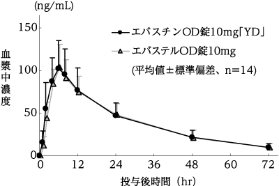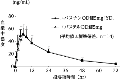 エバスチン錠5mg「YD」とエバステル錠5mgをクロスオーバー法によりそれぞれ2錠(エバスチンとして10mg)、健康成人男子13名に絶食単回経口投与して血漿中の活性代謝物カレバスチン濃度を測定した。得られた薬物動態パラメータ(AUC、Cmax)について統計解析を行った結果、両剤の生物学的同等性が確認された2)。