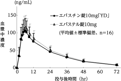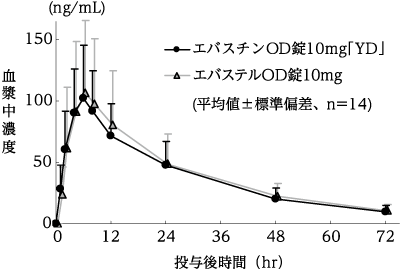 エバスチン錠10mg「YD」とエバステル錠10mgをクロスオーバー法によりそれぞれ1錠(エバスチンとして10mg)、健康成人男子16名に絶食単回経口投与して血漿中の活性代謝物カレバスチン濃度を測定した。得られた薬物動態パラメータ(AUC、Cmax)について統計解析を行った結果、両剤の生物学的同等性が確認された3)。