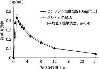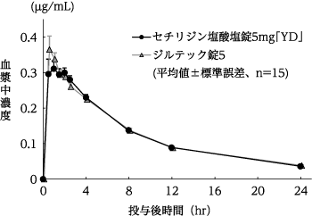 セチリジン塩酸塩錠5mg「YD」とジルテック錠5をクロスオーバー法によりそれぞれ2錠(セチリジン塩酸塩として10mg)、健康成人男子15名に絶食単回経口投与して血漿中未変化体濃度を測定した。得られた薬物動態パラメータ(AUC、Cmax)について統計解析を行った結果、両剤の生物学的同等性が確認された3)。