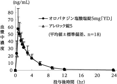 オロパタジン塩酸塩錠5mg「YD」とアレロック錠5をクロスオーバー法によりそれぞれ1錠(オロパタジン塩酸塩として5mg)、健康成人男子18名に絶食単回経口投与して血漿中未変化体濃度を測定した。得られた薬物動態パラメータ(AUC、Cmax)について統計解析を行った結果、両剤の生物学的同等性が確認された3)。
