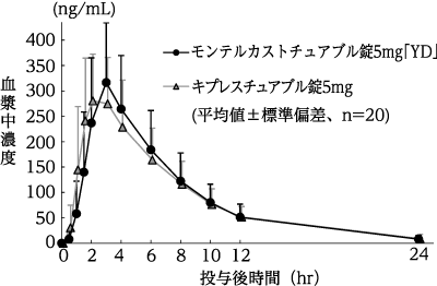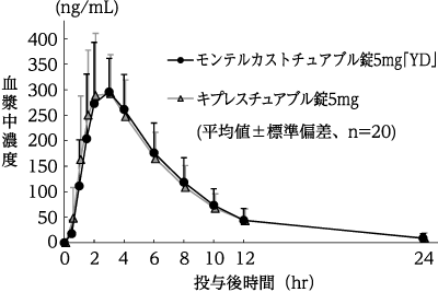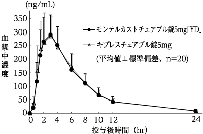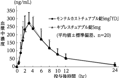 モンテルカストチュアブル錠5mg「YD」とキプレスチュアブル錠5mgをクロスオーバー法によりそれぞれ1錠(モンテルカストとして5mg)、健康成人男子20名に絶食下、口中溶解後、単回経口投与して血漿中未変化体濃度を測定した。得られた薬物動態パラメータ(AUC、Cmax)について90%信頼区間法にて統計解析を行った結果、log(0.80)~log(1.25)の範囲内であり、両剤の生物学的同等性が確認された6)。