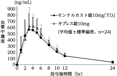 モンテルカスト錠10mg「YD」とキプレス錠10mgをクロスオーバー法によりそれぞれ1錠(モンテルカストとして10mg)、健康成人男子24名に絶食単回経口投与して血漿中未変化体濃度を測定した。得られた薬物動態パラメータ(AUC、Cmax)について90%信頼区間法にて統計解析を行った結果、log(0.80)~log(1.25)の範囲内であり、両剤の生物学的同等性が確認された4)。