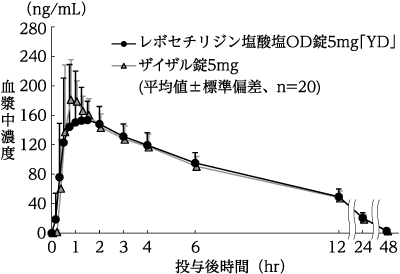 レボセチリジン塩酸塩OD錠5mg「YD」とザイザル錠5mgをクロスオーバー法によりそれぞれ1錠(レボセチリジン塩酸塩として5mg)、健康成人男子18名に絶食単回経口投与して血漿中未変化体濃度を測定した。得られた薬物動態パラメータ(AUC、Cmax)について90%信頼区間法にて統計解析を行った結果、log(0.80)~log(1.25)の範囲内であり、両剤の生物学的同等性が確認された4)。