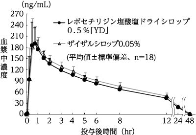 健康成人男性20例にレボセチリジン塩酸塩5mg(シロップ)を空腹時単回経口投与した時、血漿中レボセチリジン濃度は投与後0.75時間には最高血漿中濃度203.3ng/mLに到達した。血漿中濃度の消失半減期は約7.9時間であった。セチリジン塩酸塩10mg(ドライシロップ)を空腹時単回経口投与した時、血漿中レボセチリジン濃度は投与後1時間には最高血漿中濃度196.5ng/mLに到達し、血漿中濃度の消失半減期は約7.9時間であった。レボセチリジン塩酸塩(シロップ)はセチリジン塩酸塩(ドライシロップ)の半量で同様の血漿中レボセチリジン濃度が得られ、血漿中レボセチリジンのCmax及びAUC0-48は同等であった1)。