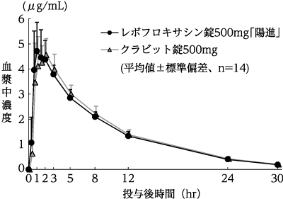 レボフロキサシン錠500mg「陽進」とクラビット錠500mgをクロスオーバー法によりそれぞれ1錠(レボフロキサシンとして500mg)、健康成人男子14名に絶食単回経口投与して血漿中未変化体濃度を測定した。得られた薬物動態パラメータ(AUC、Cmax)について90%信頼区間法にて統計解析を行った結果、log(0.80)~log(1.25)の範囲内であり、両剤の生物学的同等性が確認された6)。