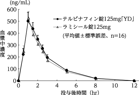 テルビナフィン錠125mg「YD」とラミシール錠125mgをクロスオーバー法によりそれぞれ1錠(テルビナフィンとして125mg)、健康成人男子16名に絶食単回経口投与して血漿中未変化体濃度を測定した。得られた薬物動態パラメータ(AUC、Cmax)について統計解析を行った結果、両剤の生物学的同等性が確認された3)。