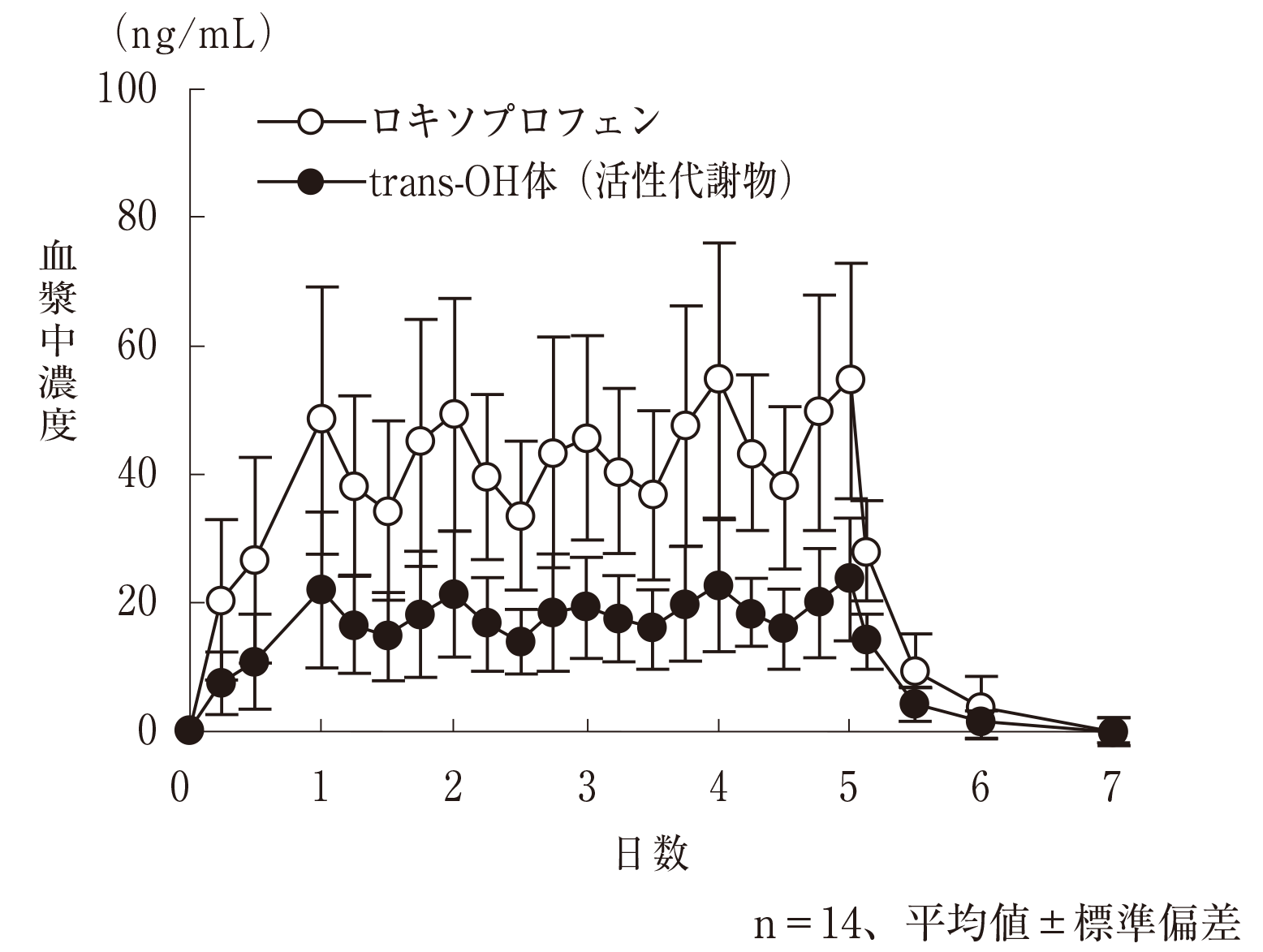 健康な成人男性14例の背部に本剤2枚を1日1回、5日間反復投与したところ、ロキソプロフェン及びtrans-OH体(活性代謝物)は投与開始後速やかに血漿中に検出され、投与期間とともに緩やかに増加し、投与後4日~5日目に経口剤投与時と比較し低い濃度で定常状態となり、投与終了後は定量限界未満へと速やかに消失した1) 。